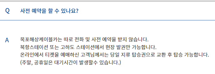 목포해상케이블카는 전화 및 사전예약을 받지 않습니다. 탑승권은 현지 북항역 또는 고하도역에서만 발급 가능합니다.