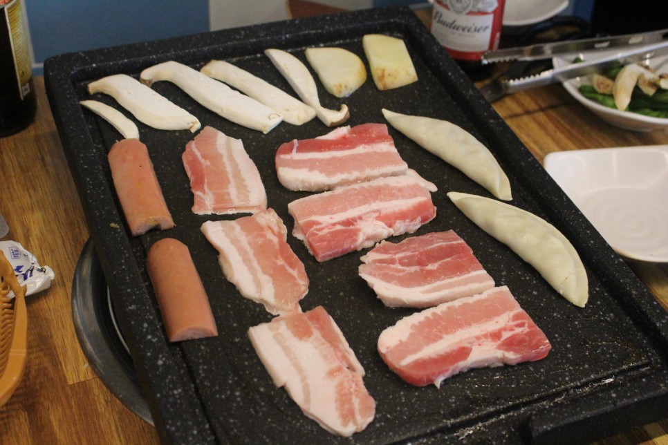 잘 달궈진 불판 위에 소고기를 올렸습니다첫 판에는 굶주린 배를 달래기 위해 가장 맛있는 등심과 부채살을 올렸어요.고기만 튀기기에는 부족하기 때문에 여러 가니쉬도 곁들여 두었더니 철판이 가득 찼습니다.
